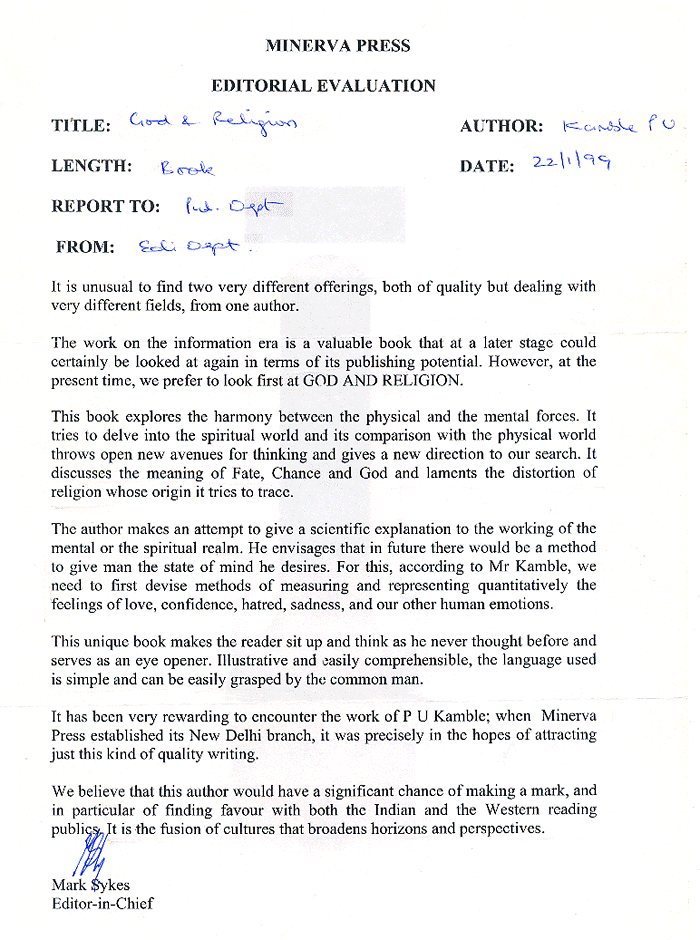 dealing with very different fields, from one author. The work on information era is a valuable book that at a later stage could certainly be looked at again in terms of its publishing potential. However, at the present time, we prefer to look first at GOD AND RELIGION. This book explores the harmony between the physical and the mental forces. It tries to delve into the spiritual world and its comparison with the physical world throws open new avenues for thinking and gives a new direction to our search. It discusses the meaning of Fate, Chance and God and laments the distortion of religion whose origin it tries to trace. The author makes an attempt to give a scientific explanation to the working of mental or the spiritual realm. He envisages that in future there would be a method to give man the state of mind he desires. For this, according to Mr. Kamble, we need to first devise methods of measuring and representing qualitatively the feelings of love, confidence, hatred sadness and our other human emotions. This unique book makes the reader sit up and think as he has never thought before and serves as an eye opener. Illustrative and easily comprehensible, the language used is simple and can be easily grasped by common man. It has been very rewarding to encounter the work of P U Kamble; when Minerva Press established its New Delhi branch, it was precisely in the hopes of attracting just this kind of quality writing. We believe that this author would have a significant chance of making a mark, and in particular finding favour with both the Indian and Western reading publics. It is the fusion of cultures that broadens horizons and perspectives. Sd/- Mark Sykes Editor-in-Chief |